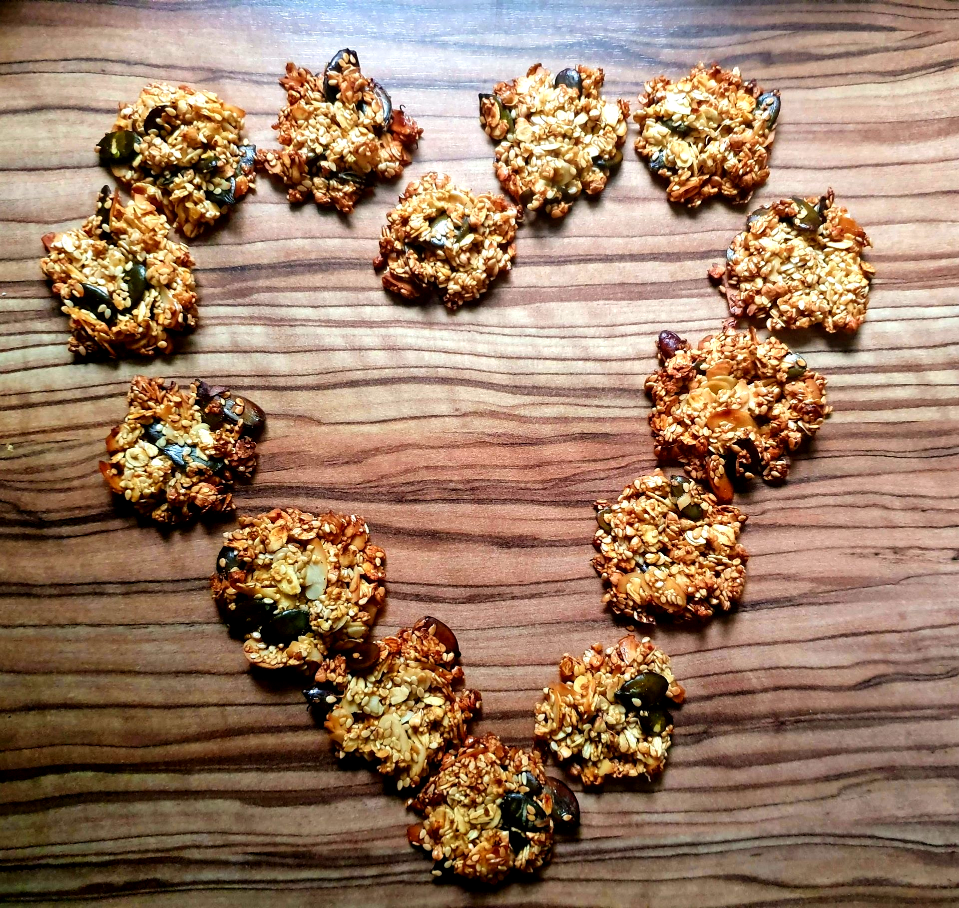 Meine Kids lieben sie, sonst essen sie keine Samen und Nüsse, aber so verpackt sind sie ganz verrückt danach. 🍪200g Samen (Leinsamen, Sesam, Mandeln Sonnenblumenkerne, Chia, Leinsamen, Kürbiskerne, gehackte Nüsse), ich hatte noch gekeimten Buchweizen mit drin. 🍪50 g kernige Haferflocken 🍪1 Ei 🍪2 EL regionalen Honig evtl. etwas Xucker / Xucker light Optional Trochenfrüchte, Spliter von 85%iger Schokolade, Kakaonibs, Zimt, Vanille Trockene Zutaten vermischen, dann den Rest dazu. Kleine Häufchen auf ein Backpapier und ca. 15 - 20 Minuten bei 160 - 180 Grad backen. Abkühlen lassen und dann erst runter nehmen.